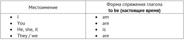 • глагол -to be (=быть), который будет иметь соответствующее спряжение в зависимости от необходимого по смыслу времени, а также лица и числа;