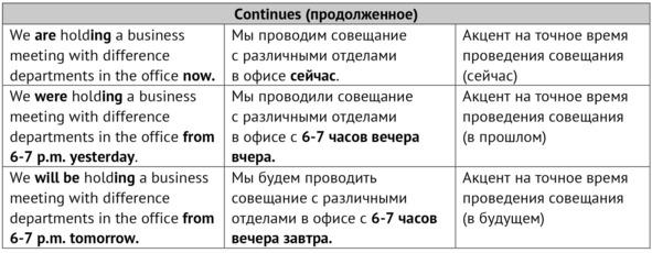 • Действие происходит с привязкой к строго определенному времени или другому действию (за описание такого действия отвечает группа времен Continues или продолженное);
