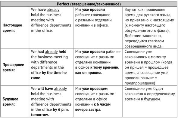 • Действие к моменту разговора о нем уже завершилось с определенным результатом (за описание такого действия отвечает группа времен Perfect или свершенное).