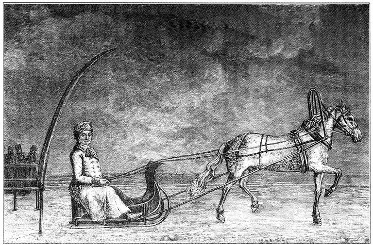 Сани бывали двуместные, большие с дышлами, запрягались парою, четвернею, иногда и шестернею цугом. Бывали и особенные беговые сани-одиночки, без кучерского места; у них была на запятках сидейка, на которой сидел верхом человек. Эти санки наружно отделывали пышно, с бронзою или в серебре, внутри обивали ярким трипом [16], полость такого же цвета, подпушенная мехом; оба полоза своими загнутыми головами сходились вместе на высоте аршин двух от земли и замыкались какою-нибудь золоченою либо серебряною фигурою, например головою Медузы, Сатира, льва, медведя с ушами сквозными для пропуска вожжей. Лошадь была манежная кургузая, в мундштуке с кутасами [17] и клапанами, в шорах с постромками, впрягалась в две кривые оглобли, с седелкою, без дуги.