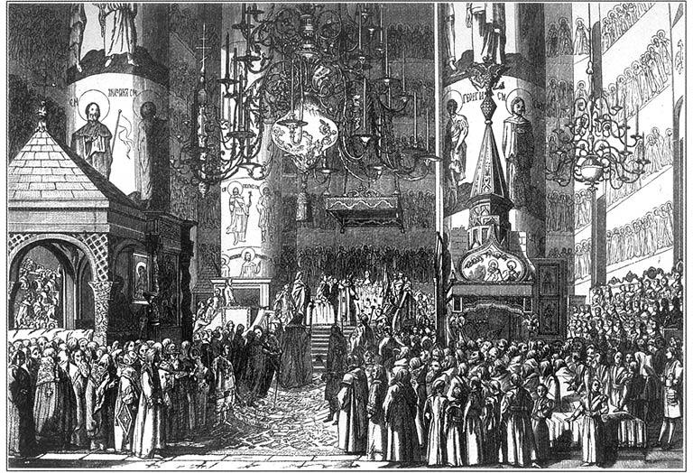 Как только государыня из дворца вышла на Красное Крыльцо, начался звон во все колокола и военная салютация. При приближении к соборным дверям государыню встретил весь церковный синклит [20], до двадцати архиереев и более сорока архимандритов во главе с архиепископом Новгородским, который поднес государыне для целования крест; митрополит Московский окропил святою водою. Государыня села на приготовленный ей престол.
