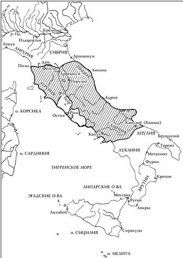 Начав с Крита и Балканского полуострова, мы описали почти полный периметр средиземноморского бассейна — Малая Азия, Лувия, Финикия, Египет, финикийские колонии в Северной Африке (Карфаген) и Иберии, на Сицилии и Сардинии, греческие — на Иберийском полуострове, в южной Галлии и на той же Сицилии. Нам осталось охарактеризовать последний источник средиземноморской классической культуры — культуру народов Апеннинского полуострова.