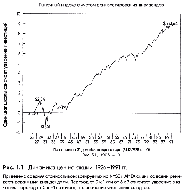 Исторические данные фондового рынка, использованные мной для анализа, являются данными рыночных индексов Центра изучения котировок ценных бумаг (Center for Research in Securities Prices, CRSP) Чикагского университета. Сюда входят данные о ежедневной или ежемесячной доходности (получаемой как от дивидендов, так и от изменения цен) по объединенным листингам рынка акций NYSE и AMEX, взвешенным по их общей рыночной капитализации. Ежемесячные данные представляют собой данные на конец каждого месяца с декабря 1925 г. по декабрь 1991 г., ежедневные — со 2 июля 1962 г. по 31 декабря 1991 г.
