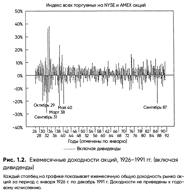 Каждый столбец на графике показывает ежемесячную общую доходность рынка акций за период с января 1926 г. по декабрь 1991 г. Доходности не приведены к годовому исчислению.