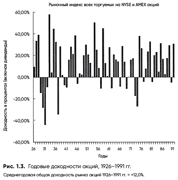 На рис. 1.3 представлены аналогичные данные, но уже не по месяцам, а по годам. Здесь легче увидеть, что рынок в целом растет, но на нем все еще присутствует волатильность, нарушающая тенденцию. Диапазон доходностей колеблется от ‒44 до +58%, хотя со времен Второй мировой войны эти значения находятся в более узком диапазоне: от ‒28 до +51%. Конечно, отдельные акции демонстрируют куда большую волатильность, чем рынок в целом, поэтому не стоит путать типичную рыночную доходность с данными отдельно взятой бумаги.