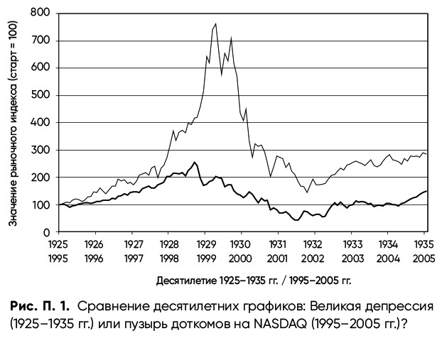 Перед тем как приступить к изучению текста 1993 г., давайте посмотрим, является ли усреднение ценности столь же действенной стратегией для современных рынков, как и для рынков того времени. Для этого обратимся к исторической перспективе, сравнив десятилетие с 1996 по 2005 г. с тем, что происходило на рынках 70 лет назад (1926–1935 гг.). Вы вряд ли застали этот период нашей истории, но, вероятно, знаете о том, что происходило на рынках в 1920-е и 1930-е гг.: огромный спекулятивный пузырь, чудовищный крах 1929 г., беспрецедентный спад капитализации компаний, постигший их в последующие за этим несколько лет, и, конечно, Великая депрессия 1930-х гг. На рис. П. 1 график движения рыночного индекса в это кошмарное десятилетие сопоставлен с другим графиком, тоже десятилетним, но отстоящим от первого ровно на 70 лет (графики приведены к одному масштабу). Это сравнение дает нам пищу для размышлений: плавный подъем, взлет в небеса, крах, почти мгновенный отскок, более болезненное и продолжительное второе падение и, наконец, устойчивый подъем из глубин ада примерно через три года. Согласитесь, сходство с событиями 70-летней давности почти сверхъестественное.