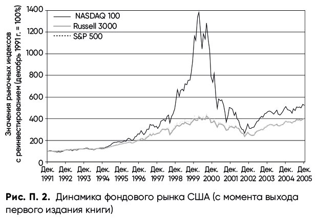 Данные для анализа в классическом издании ограничивались 1991 г. Поэтому в нескольких критически важных местах настоящего издания 2006 г. я добавил современные данные и дал ряд актуальных советов на их основе. На рис. П. 2 сопоставлены графики трех индексов, информация о которых вошла в обновленное издание: индекса NASDAQ 100, индекса S&P 500 и индекса широкого рынка Russell 3000. Вложив в конце 1991 г. в каждый из этих индексов одинаковую сумму, к 2006 г. вы бы вчетверо увеличили свои инвестиции в S&P и Russell и более чем впятеро — инвестиции в NASDAQ (если, конечно, пережили бы эту «увеселительную поездку»).