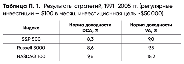 В табл. П. 1 представлена итоговая внутренняя норма доходности (internal rate of return, IRR), полученная в результате применения инвестиционных стратегий ежемесячно с декабря 1991 г., начиная с того момента, на котором заканчиваются данные классического издания. Для всех индексов усреднение ценности (VA) продолжало приносить более высокую доходность, чем усреднение затрат (DCA). Особенно хорошо стратегия VA показала себя на индексе NASDAQ, обеспечив за этот период свыше 5,5% дополнительной доходности, что более чем на 50% выше доходности от усреднения затрат (DCA).