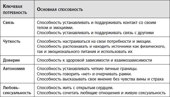 В НАРМ рассматриваются пять биологически обоснованных ключевых потребностей, которые необходимы для нашего физического и эмоционального благополучия. Это потребности в связи, чуткости, доверии, автономии и любви-сексуальности. Когда основная потребность не удовлетворена, возникают предсказуемые психологические и физиологические симптомы: нарушается саморегуляция, самоощущение и самооценка. Во взрослом возрасте способность распознавать и удовлетворять эти потребности развивается до той степени, в какой на них обращали внимание в раннем возрасте (см. таблицу I.1). Способность осознавать эти пять основных потребностей и удовлетворять их показывает, что мы выстроили надежную связь с нашими глубинными ресурсами и жизненной силой.