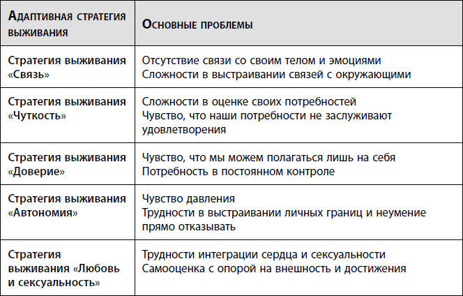 Выбор адаптивных стратегий выживания зависит от того, насколько биологические ключевые потребности удовлетворялись на ранних стадиях жизни. Эти адаптивные стратегии или стили выживания представляют собой способы справляться с нарушениями связи, дисрегуляцией, дезорганизацией и изоляцией, которые испытывает ребенок, когда его основные потребности не удовлетворяются. Каждая из пяти адаптивных стратегий выживания названа в соответствии с ключевой потребностью и отсутствующей или нарушенной основной способностью: стратегия выживания «Связь», стратегия выживания «Чуткость», стратегия выживания «Доверие», стратегия выживания «Автономия» и стратегия выживания «Любовь и сексуальность» (см. таблицу I.2).