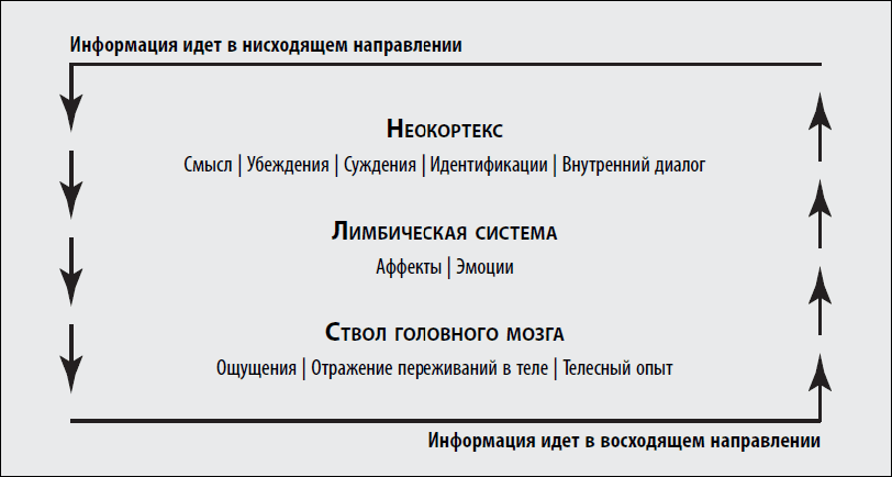 Психотерапевтические подходы, основанные на восходящей перспективе, фокусируются на теле, ощущениях и инстинктивных реакциях, которые проходят вверх через ствол мозга, воздействуя на лимбическую систему и кору больших полушарий. Информация движется от тела к мозгу и от мозга к телу в непрерывном цикле. Аналогичные потоки информации наблюдаются между когнитивными, эмоциональными и инстинктивными структурами мозга (см. приложение I.3).