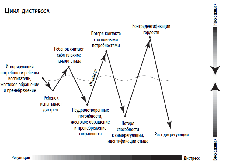 Можно предположить, что младенцы в основном полагаются на восходящие механизмы восприятия. Когда ребенок сталкивается с ранней травмой, запускается цикл дистресса. Он движется сначала снизу вверх, а затем сверху вниз, формируя непрерывную петлю, которая подкрепляет сама себя. В восходящем движении травма вызывает дисрегуляцию нервной системы. Переживая травму, люди чувствуют себя плохо. Но когда дети чувствуют себя плохо, они начинают считать себя плохими. Хроническая дисрегуляция в восходящем направлении приводит к негативным идентификациям, убеждениям и суждениям о себе. Они, в свою очередь, вызывают еще большую дисрегуляцию нервной системы. Так и возникает цикл дистресса.