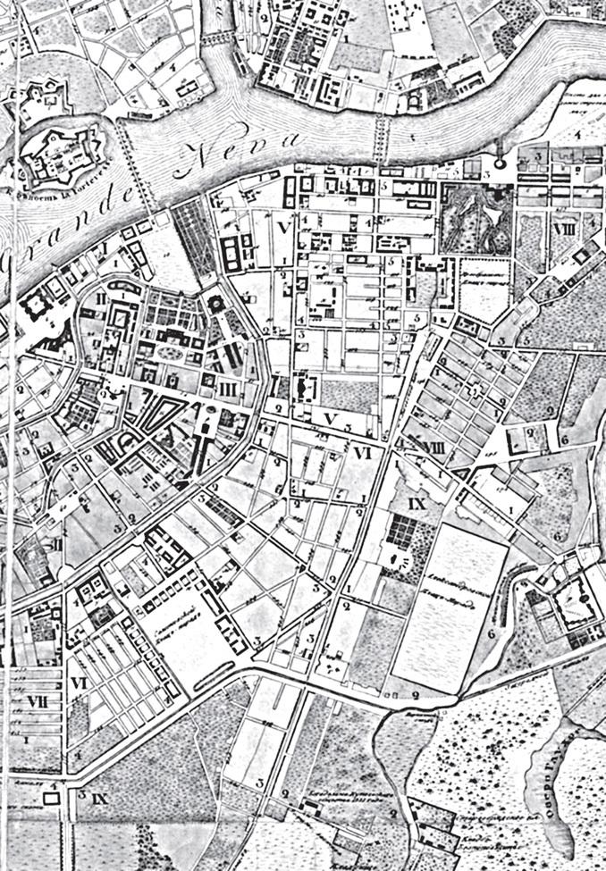 План части Санкт-Петербурга между Лиговским каналом и Невской першпективой с обозначением линий старой и новой першпектив. Архитектурии гезель И.И. Следнев. РГИА. Ф. 485. Оп. 2. Д. 1012. 4 л. 1748.