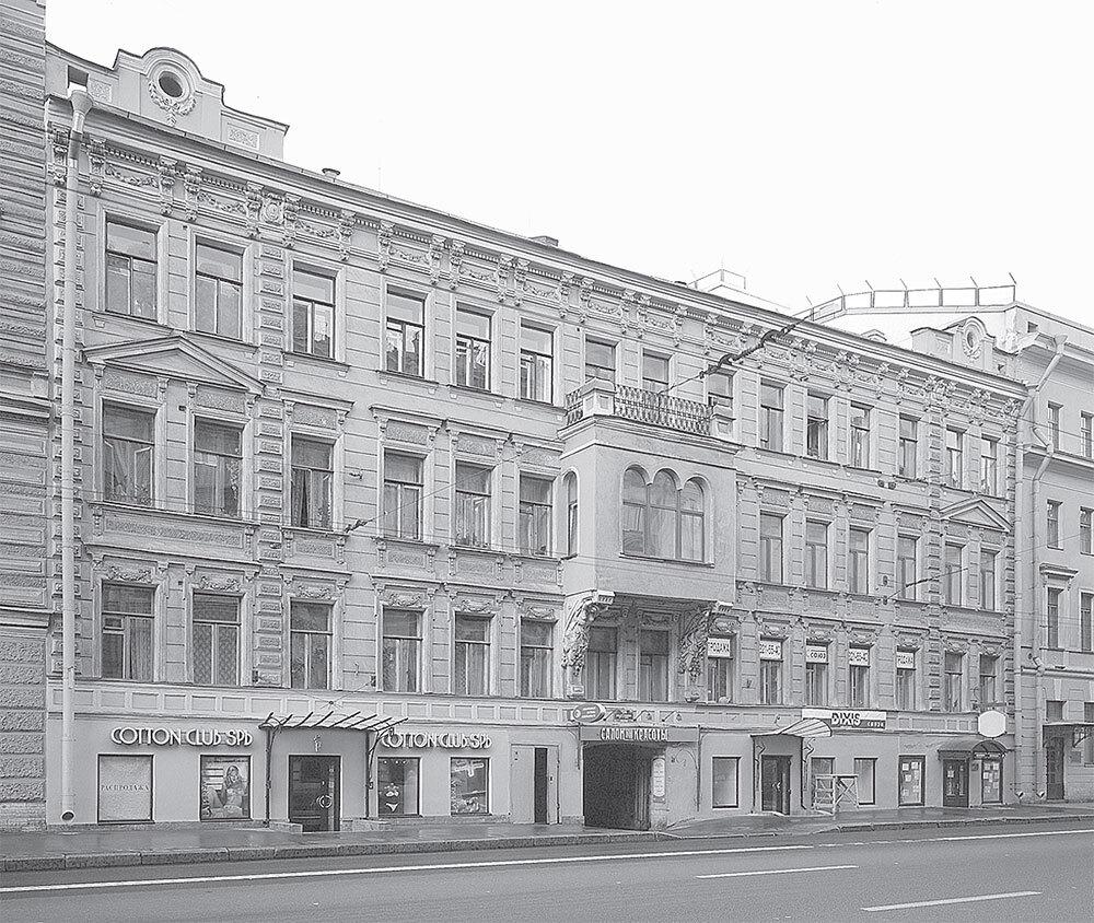 Оценочная комиссия Петербургского кредитного общества (П. А. Наранович, архитектор А. И. Климов, И. Ф. Монтандр и др.) в 1872 году показала, что главная ценность домовладения «заключается в земле, незначительная часть которой застроена каменными, частью деревянными строениями под лавками и складами», и оценила его в 24 595 рублей[32]. Получив 30 июля 1874 года от Санкт-Петербургской городской управы разрешение на строительные работы, доходный дом здесь в 1874–1875 годах построил инженер путей сообщения М. Ф. Петерсон. Архитектор Э. Г. Юргенс в декабре 1874 года отметил, что хотя отделка пятиэтажного лицевого дома на нежилых подвалах еще не закончена, его первый этаж уже занят магазинами. В 1875–1876 годах к дому были пристроены два шестиэтажных флигеля на подвалах, построен каменный четырехэтажный дом по Гончарной улице, после чего стоимость домовладения превысила 240 тысяч руб. Импозантный пятиэтажный дом стоял при изгибе проспекта, который привел к нелинейности лицевого фасада. Средняя часть фасада выделена парой прямоугольных ризалитов и балконами.