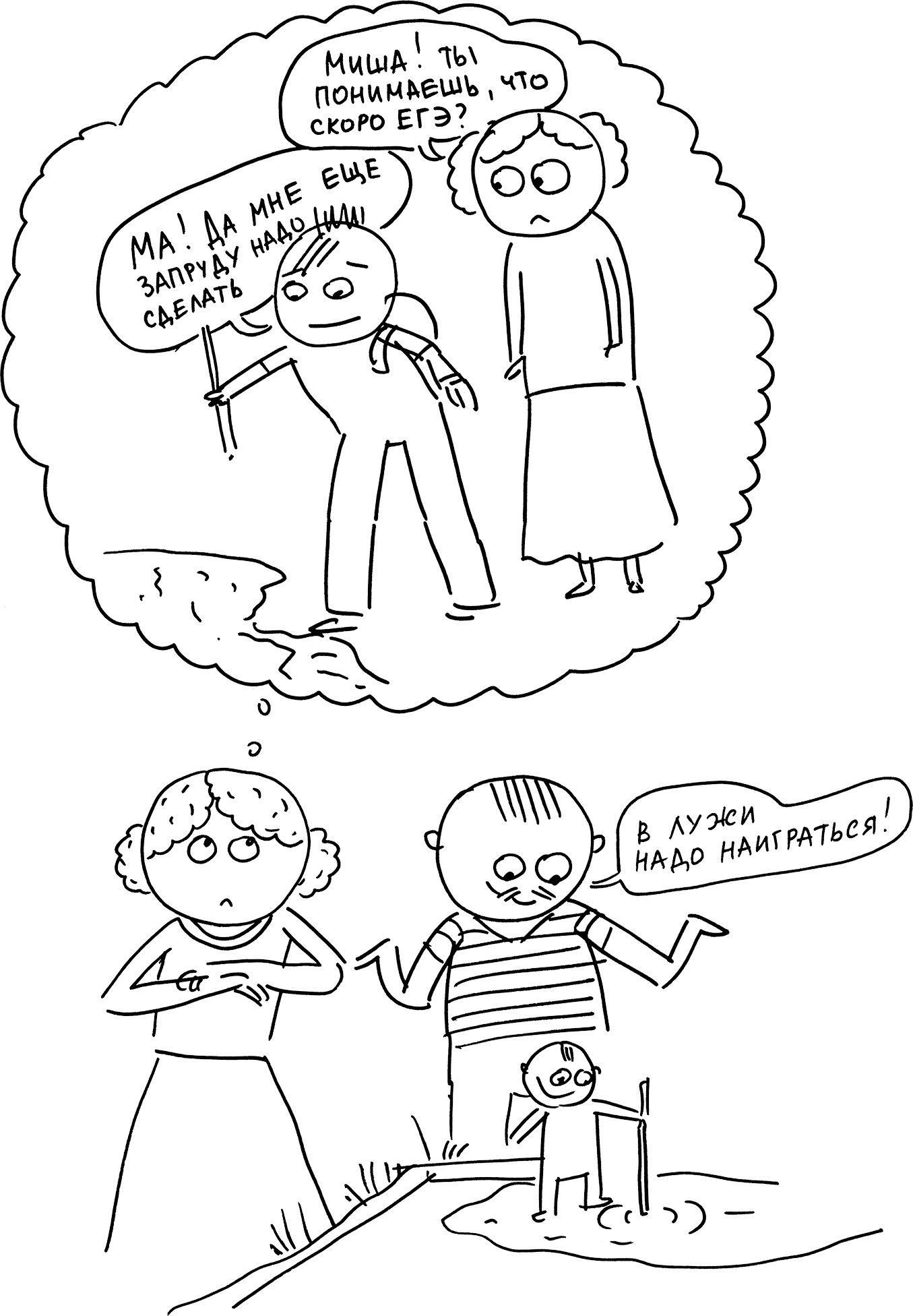А могло бы быть и по-другому: «Ой, не надо! Не лезь в лужу!» (Есть у меня гипотеза, что, если не наиграться с лужами в два года, ребенок все равно наверстает недополученный опыт позже, лет, скажем, в десять. То есть в десять лет ему будет не до учебников, если важный опыт взаимодействия с лужами он упустит.)
