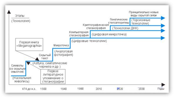 На рисунке 1 Вы можете увидеть историю становления стеганографии и возможное развитие этой науки в ближайшем будущем.