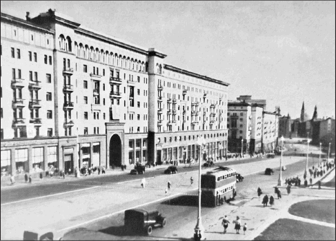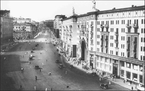 Тверская значительно расширяется в этой части. Сейчас снимается дом, заслонявший новую гостиницу Моссовета[1]. Днем и ночью гудят грузовики, подъезжающие, поворачивающие и увозящие камни и доски снимаемого здания. Скоро широкая, радостная улица будет заключать Тверскую или начинать ее и вести на Красную площадь».
