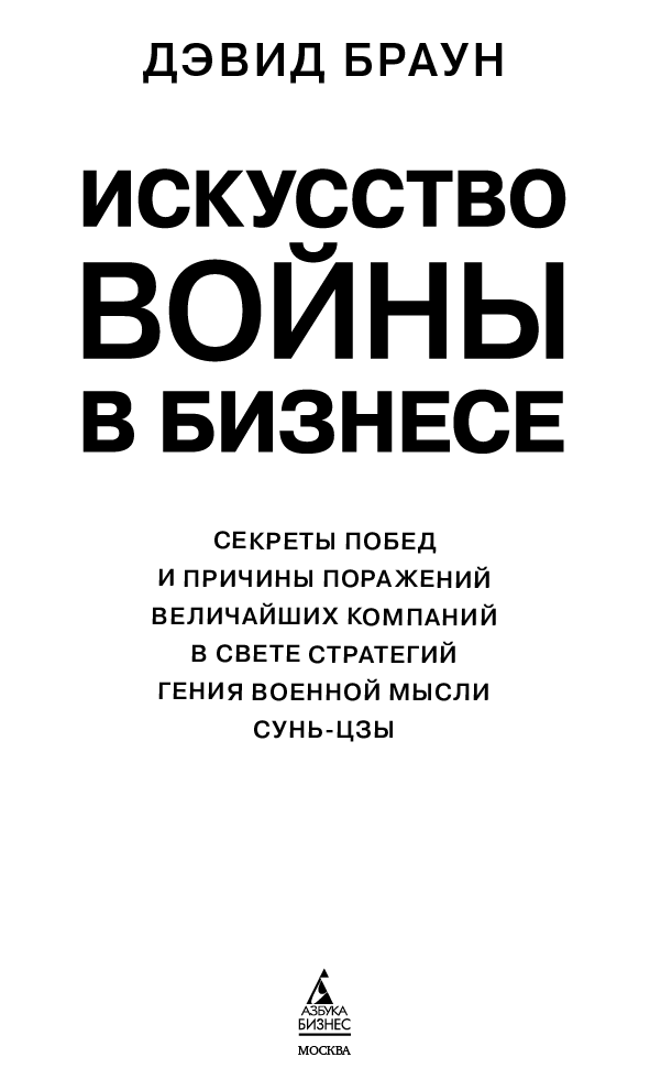 Искусство войны в бизнесе: Секреты побед и причины поражений величайших компаний в свете стратегий гения военной мысли Сунь-цзы / Дэвид Браун ; пер. с англ. Д. А. Прокофьева. — М. : Азбука Бизнес, Азбука-Аттикус, 2022.