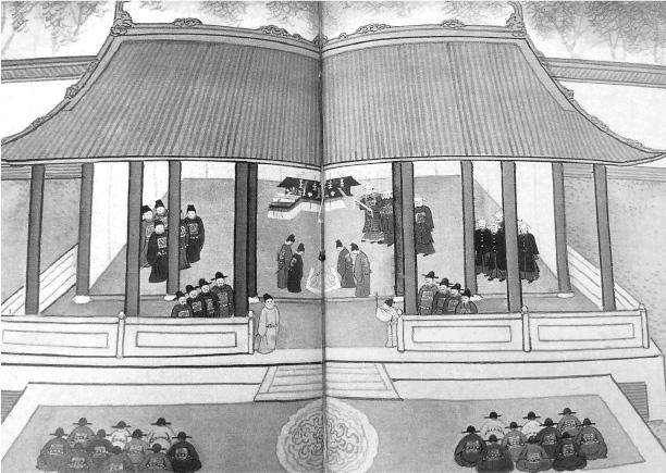 Китайские делегации, в свою очередь, совершали ответные визиты в корейские столицы: сначала Кэгён (Кэсон), а потом Хансон (Сеул), — где их, разумеется, встречали с той почтительностью, с каковой и надлежало встречать представителей Владыки Вселенной. В частности, во время официального приёма китайского посла во дворце корейский король не имел права сидеть на троне — туда помещали ритуальную табличку, которая символизировала, как мы сейчас сказали бы, виртуальное присутствие на этой церемонии китайского императора. Китайский посол входил в зал через главный вход, которым во всех остальных случаях мог пользоваться только корейский король, в то время как сам корейский монарх появлялся в тронном зале через боковую дверь. Иначе говоря, ритуал встречи с китайским послом должен был создавать впечатление, что это китайский император даёт аудиенцию своему подданному, каковым считался корейский монарх.