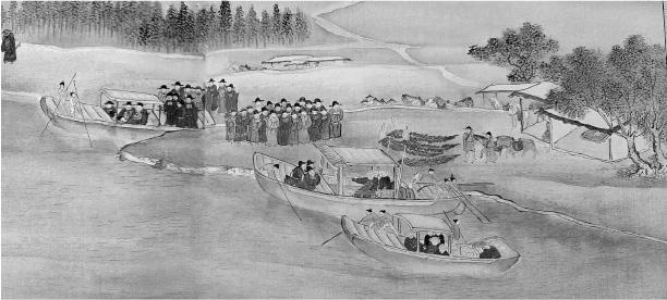 Китайский посол и его свита готовятся к переправе через пограничную реку Амнок-кан (Ялу). Рисунок придворного художника, 1725 год