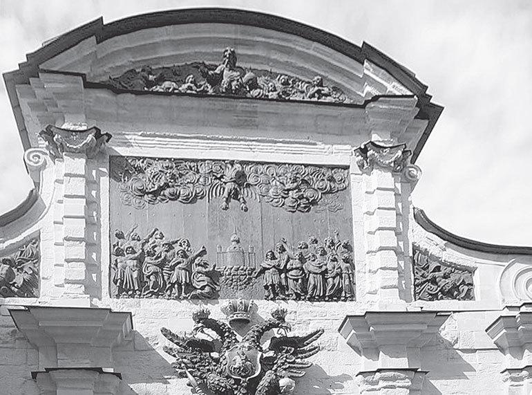 Мне кажется, это дань недавнему прошлому – все достижения России начинать с царя-реформатора[10]. Как же это «с Петра I»? А на церкви Покрова на Нерли что? На Дмитриевском соборе во Владимире, сплошь покрытом резным камнем, в том числе с изображениями человеческих лиц, фантастических животных и растений? Разве это не барельефы и не маскароны в самом прямом смысле? Вот царь Давид, играющий на гуслях и поющий псалмы, мало того, рядом с ним львы с хвостами, превратившимися в растения, а на плоскости стены, как и положено над входом, только что не на замковом камне – три человеческих лица, вероятно ангелы Святой Троицы. Что же это, если не маскароны? Вот рельефы, опять-таки над дверью, над боковым входом в тот же храм! Разве это не маскароны? А ведь это 1165 год! До первого российского императора Петра Алексеевича Романова (1672–1725) времени примерно столько же, как от наших дней до Ивана III (1440–1505), первого великого государя Всея Руси, деда Ивана Грозного – по 500 лет.