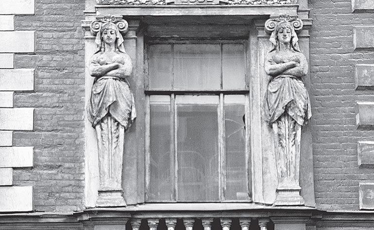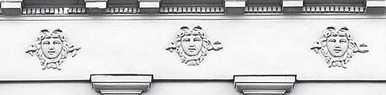На петербургских домах первые маскароны (как всякое произведение искусства) хотя и несут определенное послание нам – зрителям, но это послание еще смутно, пока оно рассчитано только на эмоциональное восприятие всего образа, на общее впечатление. В него еще не вложена конкретная информация. Строго говоря, маскарон еще не наполнился драматургией. Это просто женское лицо. Косынка, повязанная двойным узлом, скорее дань традиции, возможно, деталь античного костюма, как его понимали в эпоху Просвещения, но кого именно представляет собою маскарон, догадаться сложно.