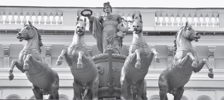 Вот так! Не Атлант у Эрмитажа, а Аполлон, коего привыкли считать в некотором роде бездельником. Впрочем, как поэтов и писателей. С кифарой в руках – Аполлон Кифаред, в окружении девяти симпатичных муз – Аполлон Мусагет – водитель муз. (Совсем как эстрадная звезда с гитарой и подтанцовкой!) А тут, поди ж ты, «уперши лбы в беду»!