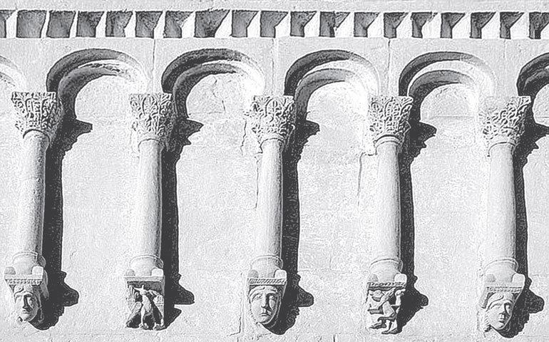 «… Если романская скульптура на Западе стихийно развивалась в сторону обособления фигуры от стены, что нашло наиболее яркое выражение в ранней готике (вторая половина XII – первая треть XIII в.), то на Руси художественная эволюция протекала в обратном направлении. Тяжелый высокий рельеф, таивший в себе возможность перерождения в круглую скульптуру, был переведен русскими мастерами на язык деревянной резьбы, а затем подчинен тому орнаментально-плоскостному началу, которое всегда так ценилось древнерусским художником с его любовью к узорочью. Тем самым круглая скульптура лишилась необходимых для ее успешного развития предпосылок. Это своеобразное явление можно особенно хорошо изучить на примере рельефов Георгиевского собора. Когда сопоставляешь его колончатый пояс с аркатурным[11] фризом в Нотр Дам де Гранд в Пуатье и церкви в Рюффеке (Шарант), делается очевидным совсем иной подход русского художника к пластике»[12].