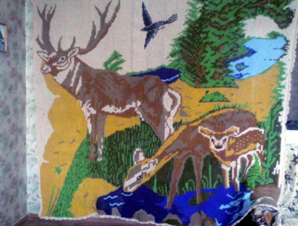 Размер этого гобелена 240 на 250 см. Связан поворотными рядами по мотивам вышивки крестом «На водопое». Гобелен вязался без схем по картинке и поперечно начиная с одного бока и заканчивая другим.