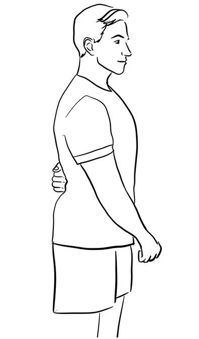 Для того чтобы измерить величину шейного изгиба позвоночника, подойдите к стене и повернитесь к ней спиной (рис. 1). После чего небольшими шагами нужно пододвигаться к стене до тех пор, пока вы не коснетесь стены лопатками и ягодицами (рис. 2). Голову при этом держите обычно. Нельзя ни опускать голову, ни гордо ее запрокидывать. Просто смотрите вперед так, как вы это делаете при обычной ходьбе. Не следует делать большие шаги, и ваши пятки не должны касаться стены. Первое касание стены ягодицами и лопатками должно вас остановить. Именно в этом положении следует замерить расстояние от вашего затылка до стены. Вы можете это сделать самостоятельно. Для этого следует удерживать голову неподвижно, а пальцами руки замерить это расстояние (1, 2, 3 или более пальцев) (рис. 3, 4).