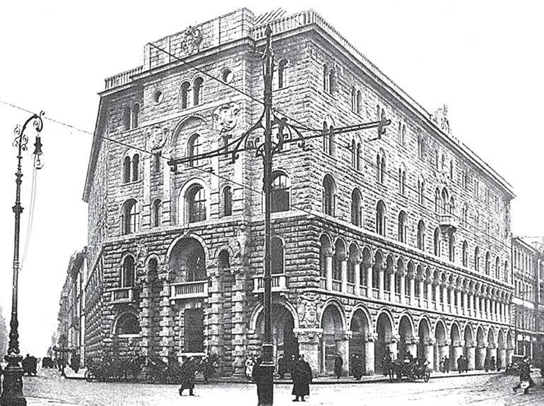Поначалу банк арендовал дом Гардера на Английской наб., 18, а в 1872 г. появилась возможность выкупить его, что и было сделано, за 120 тыс. руб. Правда, место это оказалось не совсем удачным, так как находилось в стороне от центральной магистрали города. Вот почему в 1904 г. банк переехал в дом компании «Зингер», о котором мы еще будем говорить отдельно, причем дом на Английской набережной банкиры сдали в аренду частным лицам. Казалось бы, что более удачное место, чем здание напротив Казанского собора, и представить трудно, однако довольно быстро банку здесь стало тесно, так как ограниченные площади не позволяли расширять дело. Ко всему прочему, отделы банка находились в разных частях дома, иногда не связанных между собой, а часть офисов компания «Зингер» сдавала посторонним арендаторам, не занимающимся банковской деятельностью.