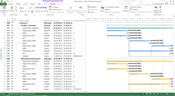 Диаграмма Ганта. Просмотр таблицы задач в одной половине представления и графических отрезков, соответствующих длительностям задач, в другой его половине.