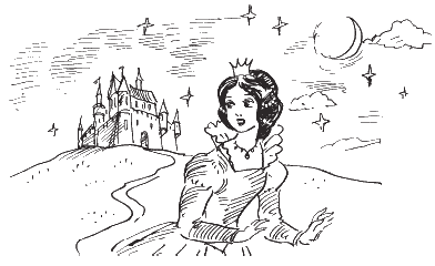 Вдруг на поляну выехала незнакомая молодая королева. Ничего не скажешь, была она красавица из красавиц! Чёрные косы падали до самой земли. На голове у неё была золотая корона, украшенная рубинами, похожими на капельки крови. А в её огромных глазах вспыхивали огненные искры.