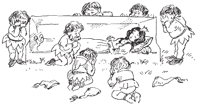 Тем временем жизнь Белоснежки становилась все тяжелее. Королева приказывала ей стирать бельё в холодном ручье, чистить песком посуду, закопчённую на огне. Потом отняла у неё туфельки и заставляла её пасти на каменистом склоне десять овечек. В кровь изрезала Белоснежка свои нежные ножки. Но что делать, приходилось терпеть.