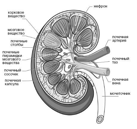 Выводные каналы и почечная лоханка образуют внутренний слой почек, который называется «мозговым». Почечная лоханка представляет собой полость, переходящую в мочеточник – узкую длинную трубочку диаметром от шести до восьми миллиметров и длиной до тридцати сантиметров. Оба мочеточника, правый и левый, впадают в мочевой пузырь.