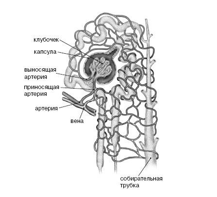 Клубочек с капсулой, канальцем и расположенными рядом сосудами образует нефрон – структурную единицу почки. В почке человека около миллиона нефронов.