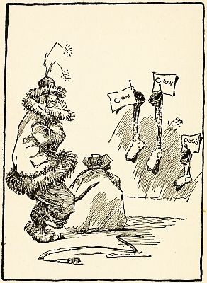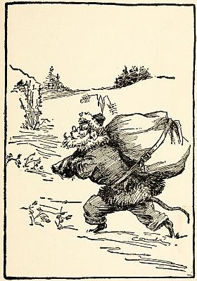 Well, he had to work pretty hard, I tell you, to get things ready. It wasn't so hard to get the presents as it was to rig up his Santa Claus dress. He found some long wool out in Mr. Man's barn for his white whiskers, and he put some that wasn't so long on the edges of his overcoat and boot tops and around an old hat he had. Then he borrowed a big sack he found out there, too, and fixed it up to swing over his back, just as he had seen Santa Claus do in the pictures. He had a lot of nice things to take along. Three tender young chickens he'd borrowed from Mr. Man, for one thing, and then he bought some new neckties for the Hollow Tree folks all around, and a big, striped candy cane for each one, because candy canes always looked well sticking out of a stocking. Besides all that, he had a new pipe for each, and a package of tobacco. You see, Mr. Dog lived with Mr. Man, and didn't ever have to buy much for himself, so he had always saved his money. He had even more things than that, but I can't remember just now what they were; and when he started out, all dressed up like Santa Claus, I tell you his bag was pretty heavy, and he almost wished before he got there that he hadn't started with quite so much.