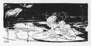 When she reached the end the White Youth was there to take her in his arms. He carried her to the middle of the river, where there was a little island, and the watching Goblin saw them sit upon the soft green grass in the moonlight, but he could not hear what they said.