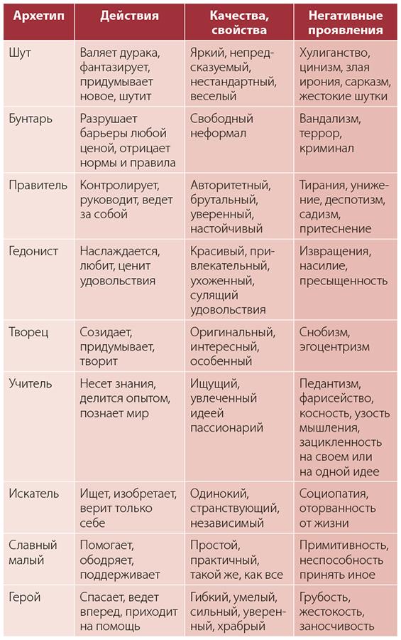 Сжатое описание общих черт всех двенадцати архетипов можно уместить в одной таблице.