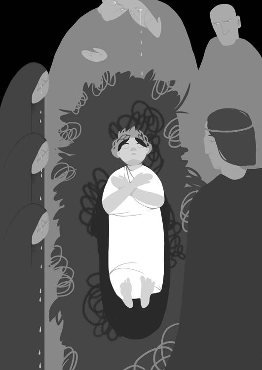 Вот он лежит посреди атрия, к дверям ногами, весь в цветах, вином фалернским политый, к погребению готовый…
