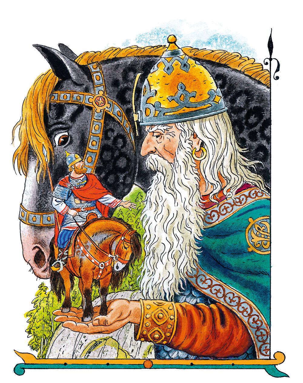 Закатилось красное солнышко за горы высокие, рассыпались по небу частые звёздочки, родился в ту пору на матушке-Руси молодой богатырь – Вольга Всеславьевич. Запеленала его мать в красные пелёнки, завязала золотыми поясами, положила в резную колыбель, стала над ним песни петь.