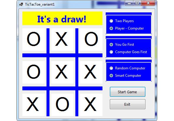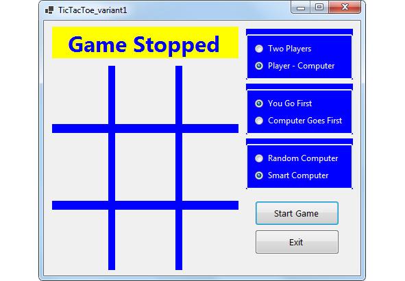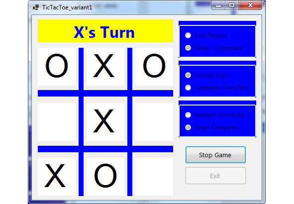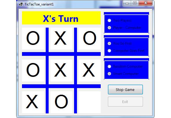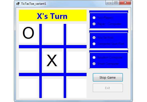 В этом состоянии игры мы нажимаем на желаемый квадрат. Компьютер тогда поместит свою метку, передавая нам очередь. После каждой метки плата исследована на победу или ничью. Вы продолжаете чередовать игру, пока нет победы, сетка полна или пока Вы не нажимаете Stop Game. Игра работает таким же путём для двух игроков, с этими двумя игроками, чередующими щелчки, отмечающие сетку.