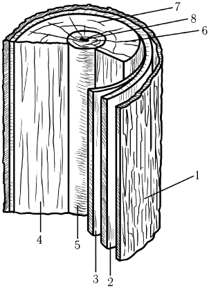 Рис. 1. Структура древесины на поперечном разрезе: 1 – пробковый слой коры; 2 – лубяной слой коры; 3 – камбий; 4 – заболонь; 5 – ядро; 6 – сердцевинные лучи; 7 – годичные кольца; 8 – сердцевина