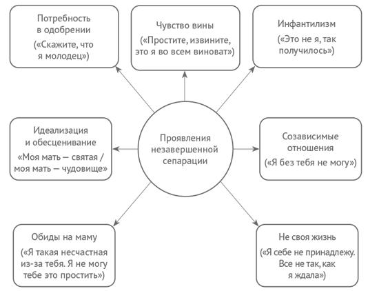 Откликается? Уверены, многим что-то подобное знакомо. Как вы думаете, что объединяет такие разные, порой диаметрально противоположные мысли и чувства, почему они попали в один список? Все это — признаки незавершенной сепарации от мамы. Проявления эти разнообразны и могут побуждать совершать поступки, которые приносят нам боль и страдания, мешают жить полноценной самостоятельной жизнью, жить по-взрослому. В следующей истории мы выясним, какие проявления незавершенной эмоциональной сепарации заставляют героиню поступать определенным образом. В книге мы подробно рассмотрим каждое из этих проявлений и разберем, какие действия помогут улучшить качество жизни.