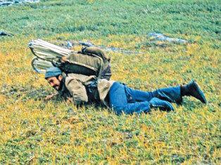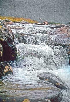 Когда карабкались вверх по Косью – трудно, но жить можно было. Если берег пологий, байдарку на парашютной стропе корабликом тащишь, как бурлаки на Волге. А если порог или каньончик – прыгай в воду по пояс, толкай ее между камней. Камни скользкие, падаешь то и дело, руки в ссадинах, колени разбиты… Настоящий ад начался, когда мы прошли границу леса и стали подниматься на перевал. На снимке-то я придуриваюсь – типа, устал очень. А по правде, отстал я однажды на каменной осыпи, вверх идти страшно, вниз – еще хуже, за плечами байдарка проклятая, центр тяжести у тюка выше головы… Думал, все, пропал Мишка на Севере! (см. фото 10)