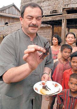 Из всех вопросов, который задают незнакомые люди, есть несколько, которые начисто сбивают меня «с катушек». Самый ненавистный: «Ой, Михаил! А вы правда всё это ели?!» Отвечаю: неправда! Тайный Всемирный Центр Клонирования человека давно изготовил по моей просьбе мою надувную действующую копию. Её-то мы и возили с собой. Она-то и ела всю эту гадость! Что же касается пауков-птицеедов, один из которых на этом фото ждет своей печальной гастрономической участи… Не помню названия местности в Камбодже (на полдороге между Сьенрепом и Пномпенем), но там этот деликатес пользуется повышенным спросом. У дороги дежурят продавщицы с целыми корзинами жареных пауков и бросаются на каждый проезжающий мимо автотранспорт, как пауки бросаются сами знаете на кого. Паук же – вполне симпатичное и безобидное создание, у него мягкие мохнатые лапки, которые щекочут кожу, когда он ползет по твоей руке. Живут птицееды в глубоких норках, которые надо хорошенько расковырять палкой, чтобы выманить их обитателей на свет божий. А дальше все жестоко и просто: масло, чеснок, можно немножко любых специй. Честно говоря, похоже на жареную курицу. Из всей коллекции гадости, мной перепробованной, камбоджийские пауки оставили самые приятные воспоминания. Да и если разобраться: чем таракан, к примеру, отличается от креветки? Разве что в последней мяса побольше, и живет она в воде, тогда как таракан более мускулист и предпочитает сушу. Приятного аппетита! (см. фото 13)