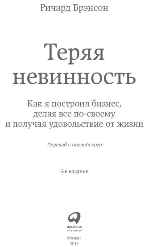 Теряя невинность: Как я построил бизнес, делая все посвоему и получая удовольствие от жизни / Ричард Брэнсон; Пер. с англ. — 6-е изд. — М.: Альпина Паблишер, 2017.