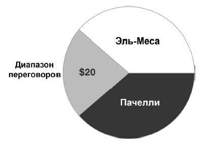 В случае с Пачелли и Эль-Меса мы предположили, что обе стороны вооружены в равной степени, поэтому могут рассчитывать на примерно равные доли, Но что, если Пачелли столкнутся с непредвиденными событиями? Например, федеральные спецслужбы арестуют высшее руководство, заморозят банковские счета, изымут арсеналы с оружием и запасы наличности, Предположим, шансы Пачелли победить в войне с Эль-Меса упадут из-за этого до 20 %. Эль-Меса тем временем увеличит прибыль от наркоторговли, нарастит могущество, создав выигрышные альянсы. Диапазон переговоров в этом случае изменяется: если раньше Пачелли могли рассчитывать на 40–60 долларов Белло, теперь на их долю останется 16–36 долларов [4]. С точки зрения Пачелли, это выглядит так.