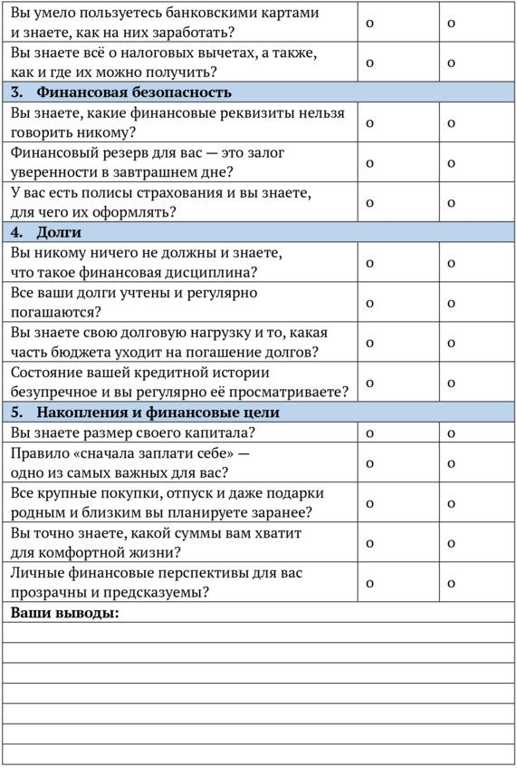 Ваша задача — пройтись по всем основным пунктам, выписать вопросы, на которые вы ответили «нет», и навести в них порядок, потому что если, например, вы не знаете размера своего капитала, то вы не сможете грамотно составить инвестиционный портфель с учетом необходимой финансовой подушки.