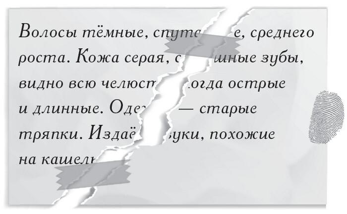 Цапка не одета, а обмотана какими-то грязными тряпками. Я думаю, что это обрывки одежды людей, которых она убила. А её пальцы заканчиваются острыми, как бритвы, когтями. Или будет правильно сказать, что у неё крючковатые когти вместо пальцев. Цапка обитает в темноте, иногда может показаться в сумраке и никогда не выходит на свет. Она его боится. Но есть места, куда это чудовище не может ступать даже в темноте, и поэтому я ещё жив.